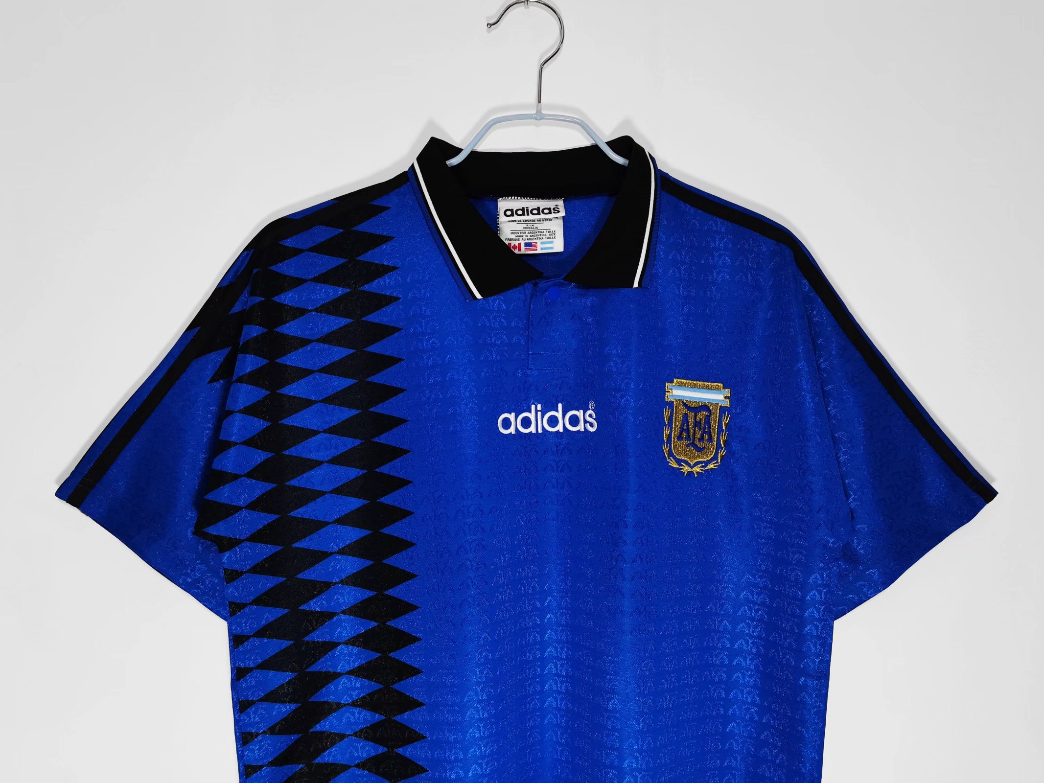 Camiseta retro de la Selección Argentina, segunda equipación del Mundial USA 1994. Diseño clásico en color azul marino con detalles celestes y blancos, utilizada por figuras como Diego Maradona y Gabriel Batistuta.